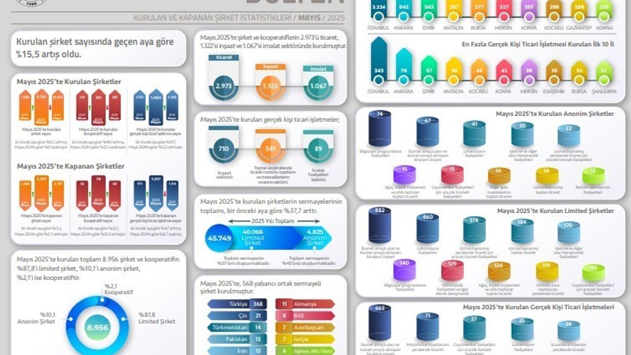 Mayıs 2025’te kurulan toplam 8 bin 956 şirket ve kooperatifin yüzde 87,8’i limited şirket, yüzde 10,1’i anonim şirket, yüzde 2,1’i ise kooperatif şirketi olarak kayıtlara geçti. Şirket ve kooperatiflerin yüzde 37,3’ü İstanbul, yüzde 11’i Ankara, yüzde ise 6,3’ü İzmir’de kurulurken, Mayıs ayında Ardahan’da şirket kuruluşu gerçekleşmedi.