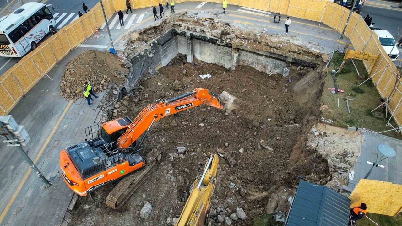 Meydana gelen çökme sonrası bölgeye Ankara Büyükşehir Belediyesi (ABB) ekiplerinin göçüğün onarılması ve zeminin güvenli hale getirilmesi için gerçekleştirdiği çalışmalar havadan görüntülendi.